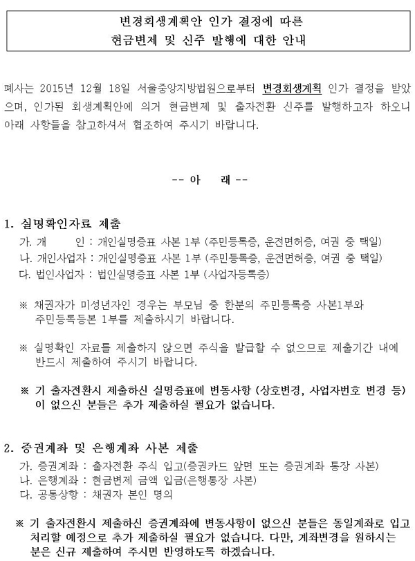 변경회생계획안 인가 결정에 따른 현금변제 및 신주 발행에 대한 안내 첨부이미지 : 출자전환 안내문001(2).jpg