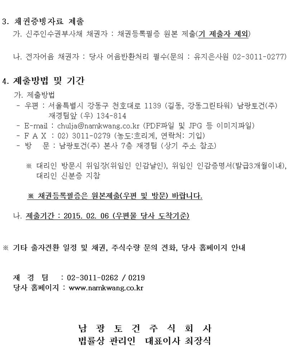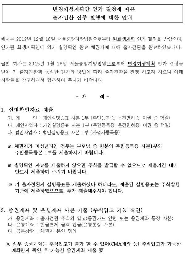 변경회생계획안 인가 결정에 따른 출자전환 신주발행에 대한 안내 첨부이미지 : 출자전환 안내문002(연락처수정) 20150223.jpg