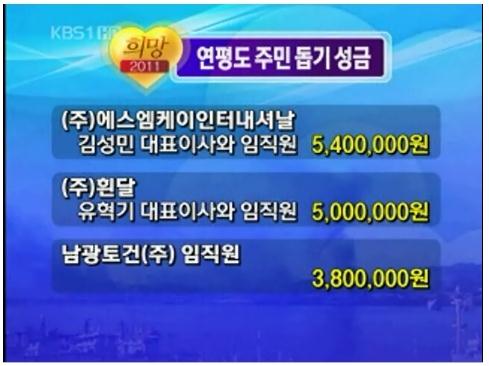남광토건㈜(대표이사 사장: 이동철 李東哲)은 연평도 사태로 인한 주민들을 돕기위해 KBS에 성금을 기탁하였다.