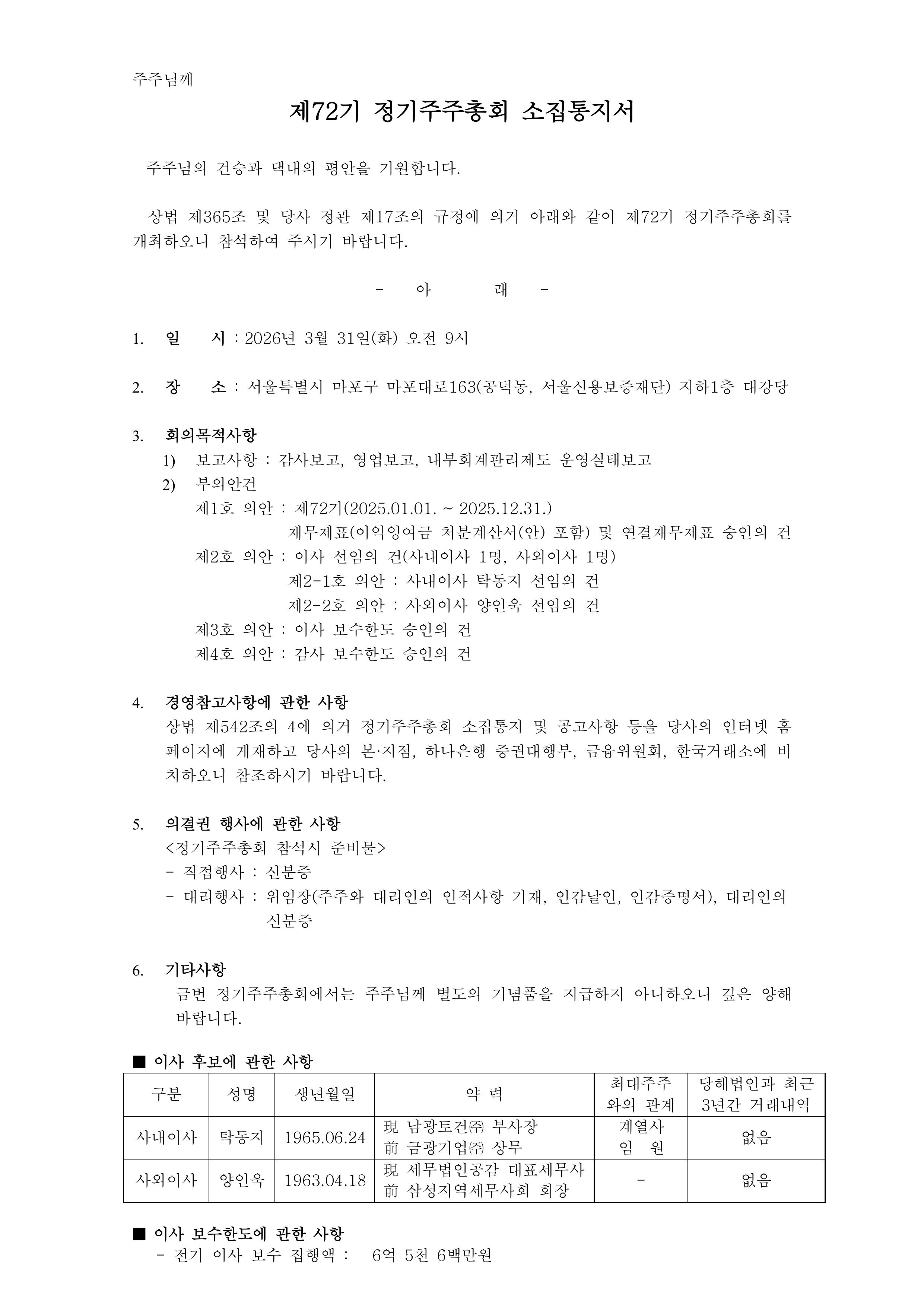 72기 정기주주총회 소집통지서